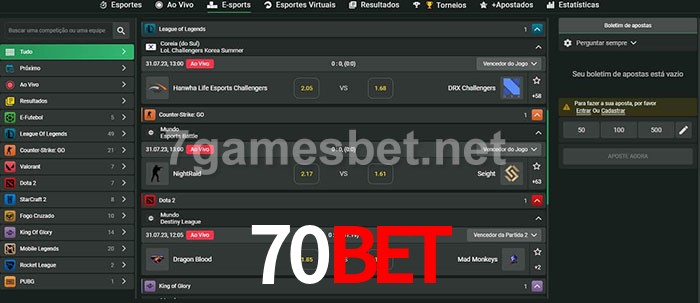 O 70bet oferece uma grande seleção de opções de apostas em e-sports com probabilidades competitivas